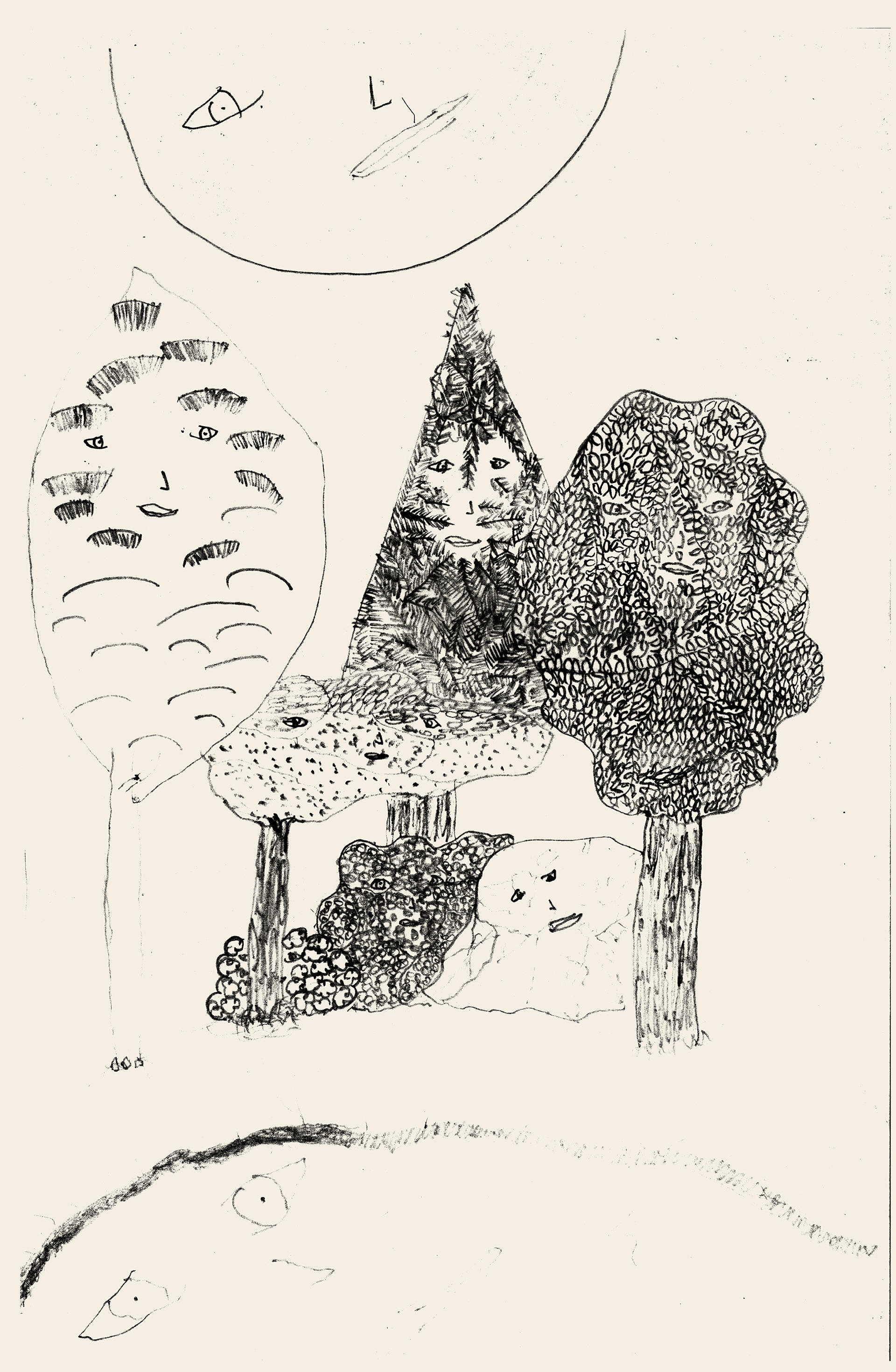 Dos arboles, un pino, un arbusto, una lago, un loto, una piedra y el sol
